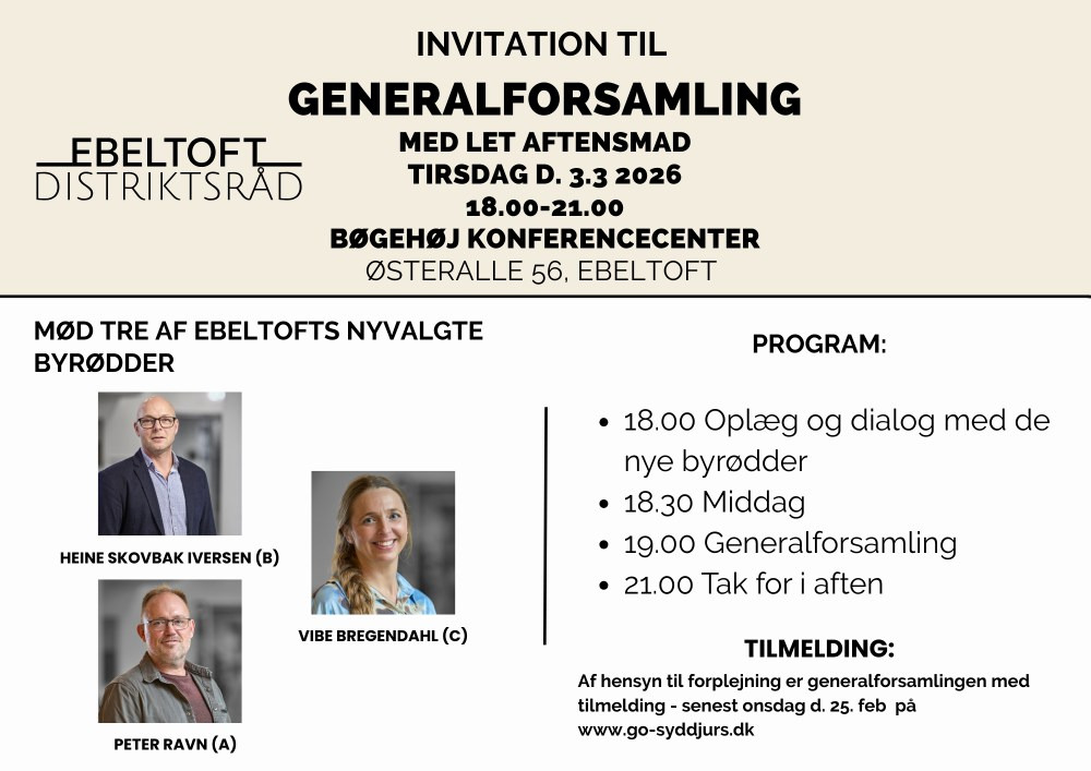 Ebeltoft Distriktsråd inviterer alle interesserede til årets generalforsamling, som finder sted i Bøgehøj Konferencecenter. Det bliver en spændende aften, hvor tre nyvalgte byrådsmedlemmer vil give et indblik i deres nye arbejde.